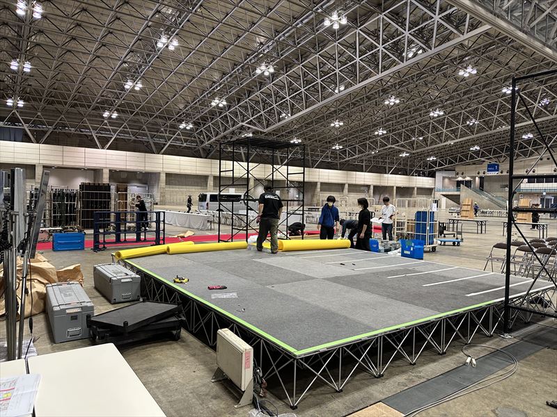 ステージ本体の組み立てが完了した後は、イベントカラーに合わせて黄色のパンチカーペットを施工し、会場全体に統一感のある明るいステージへと仕上げていきます。視認性も高く、イベントの雰囲気をより一層盛り上げるステージとなります。