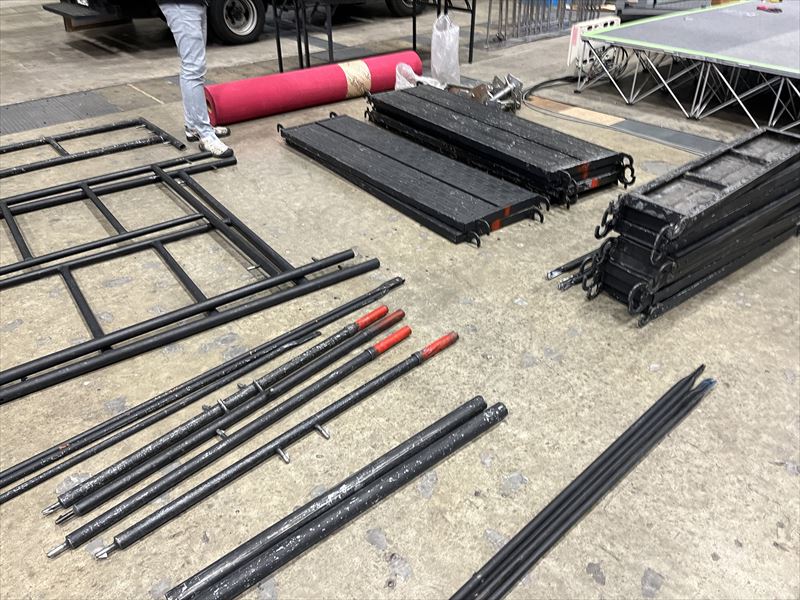 ステージの設営が完了した後は、照明や音響機材を設置するためのイントレを組んでいきます。写真のような専用機材を使用して組み立てることで、安定性と安全性を確保したイントレが完成します。
