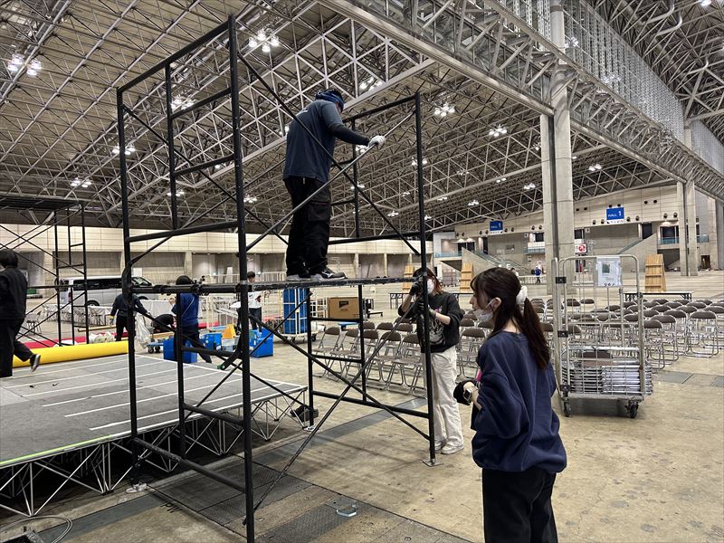 まずは簡易ステージを使用して、メインとなるステージの設営を行いました。複数の簡易ステージを組み合わせることで、会場に合わせた広さと高さを確保し、大規模なステージを構築しています。
