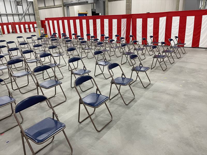 この正面ステージを中心に椅子や紅白幕なども設置していくので、お客様にも確認していただきながら真ん中をしっかり決めていきます!