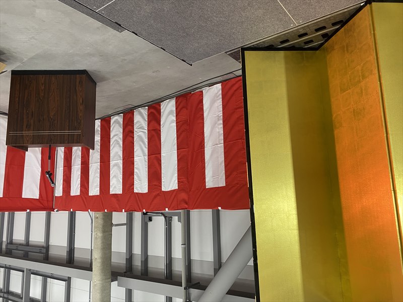 紅白幕を周囲に回してお祝いムードを演出しています!簡易ステージや音響機材を設営して本格的な式典会場に仕上がりました!テープカットなどの設営も可能なのでお祝い事、式典の設営はトップスプランへお任せください!