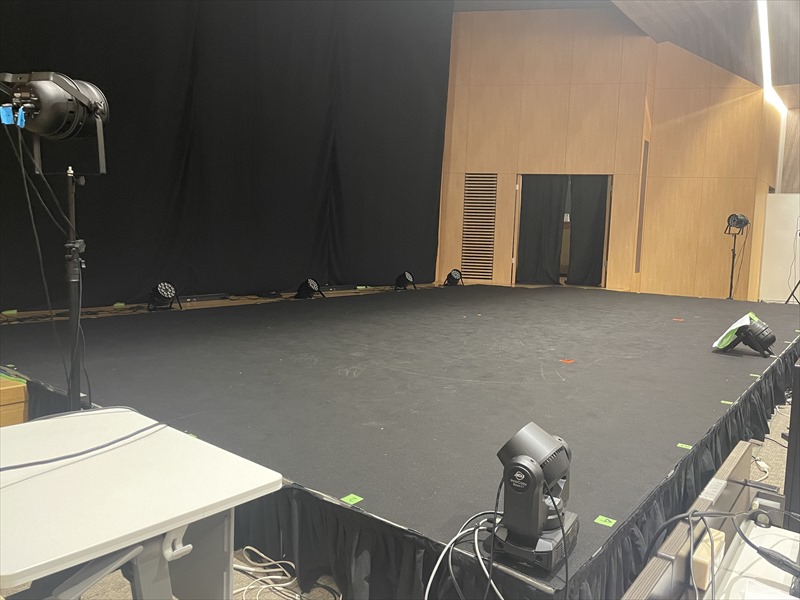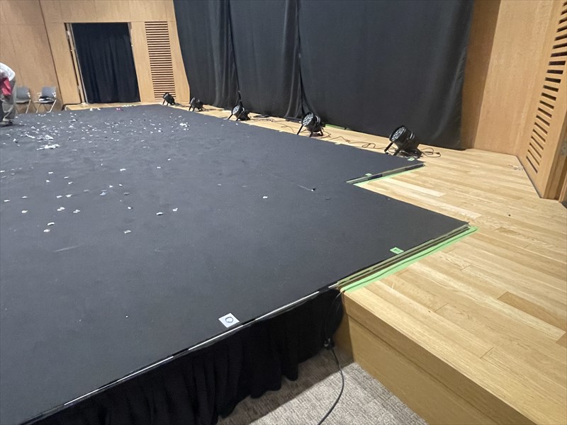 もともとあるステージだけでは広さが足りないということで、まず簡易ステージを組み合わせてステージを拡張。これにより、出演者がよりのびのびとパフォーマンスできるスペースを確保しました。
