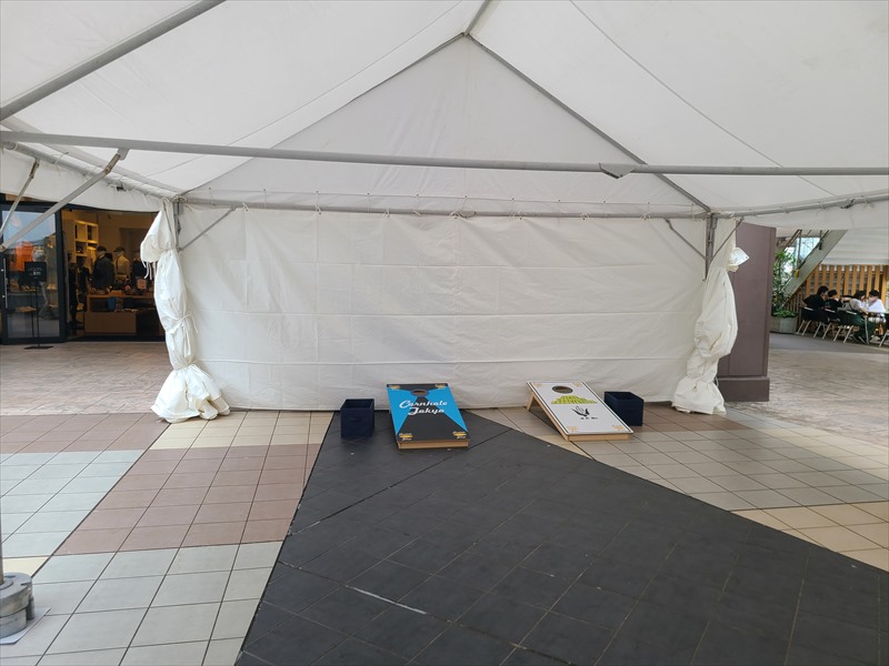 日本ではあまりなじみのないマイナースポーツの体験イベントで、フィンランド発祥でボウリングに似たモルックという競技やアメリカ発祥のコーンホールという穴の開いたボードにトウモロコシの豆が入った袋を投げて穴に入れる競技などを実際に体験してスポーツのルールや楽しさを広めるといったものでした!設営が夜でイベント自体が日中ということもあり、実際にイベントを見ることはできませんでしたが普段から沢山のお客さんが集まるショッピングモールでのイベントだったので、とても賑わいのあるものだったのではないでしょうか?