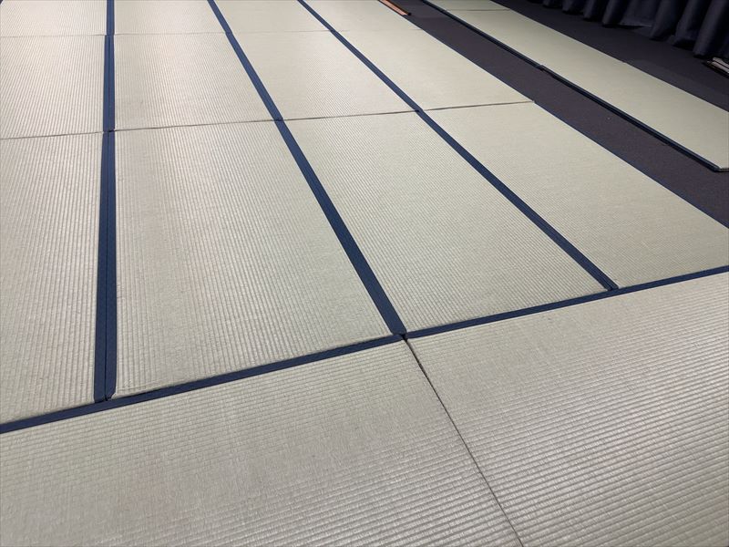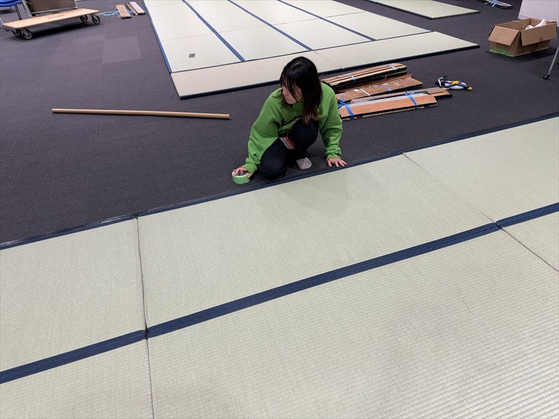 レイアウト変更の可能性があると事前にお伺いしておりましたので、当日は畳止めを多くお持ちし、どのようなレイアウトでも対応させて頂けるようにしました!畳はレイアウトを会場に合わせて変更する可能性が高いのですが、事前にお伝え頂くことでよりスムーズに対応できます!