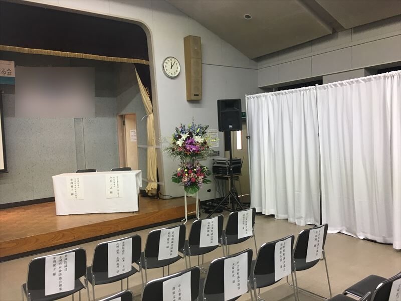この間仕切りカーテンが無いと、厳粛なシンポジウムのイメージがなくなってしまいますので重要な会場設営ですね!式典花も手配させて頂き、会場を華やかにしております。壇上のテーブルクロス、席札なども弊社で手配させて頂きました!HPに載っていない細かい部分もぜひトップスプランにまとめてご依頼ください!
