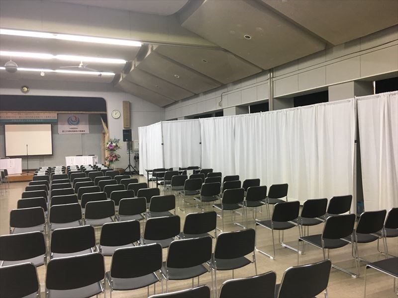 ステージの両サイドを白の間仕切りカーテンで仕切っております。
