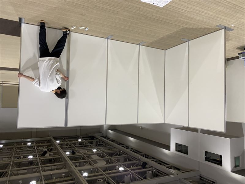 まずはパネルから運び入れ、複数のブースに分かれるように設置していきます!会場全体のレイアウトを確認しながら、一枚一枚慎重に配置を進めます!パネルの設置は、単に並べるだけでなく、空間の広がりやブースごとの役割を意識して作業しました!