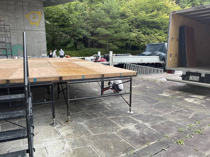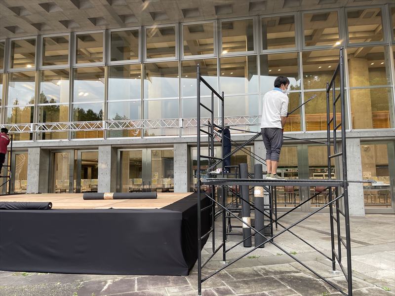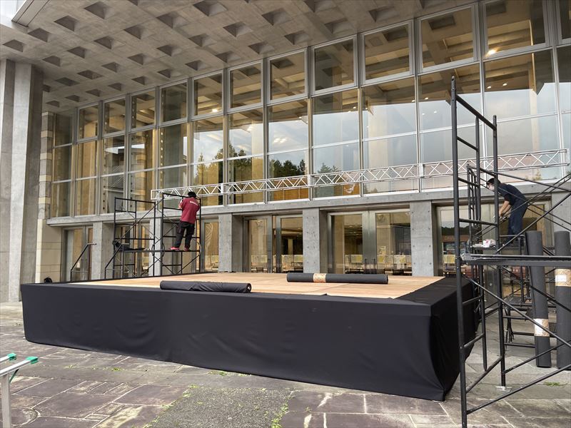 弊社では、イントレの設置に入らせていただきました!イントレは二段のものを四基、ステージの四方へ配置しています。このイントレに照明などを吊り下げて、夜に暗くなった後でも雰囲気のあるステージになるんですね!