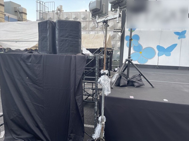 ステージと雰囲気が合うように、白のテントの横幕ではなく、暗幕を横幕として使用しています。