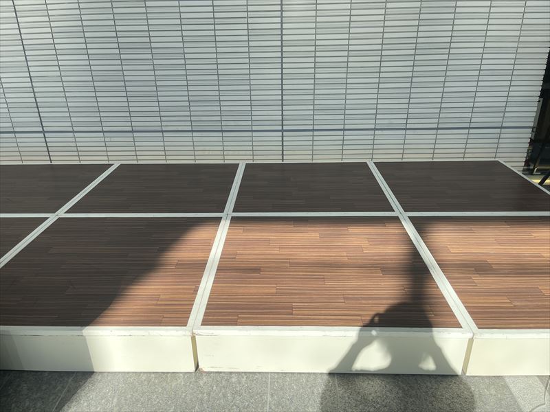 まずは式典にふさわしい場所を選定し、土台となるステージに赤いパンチカーペットを丁寧に敷き込み、その上に式典会場のメインスペースを作りました!