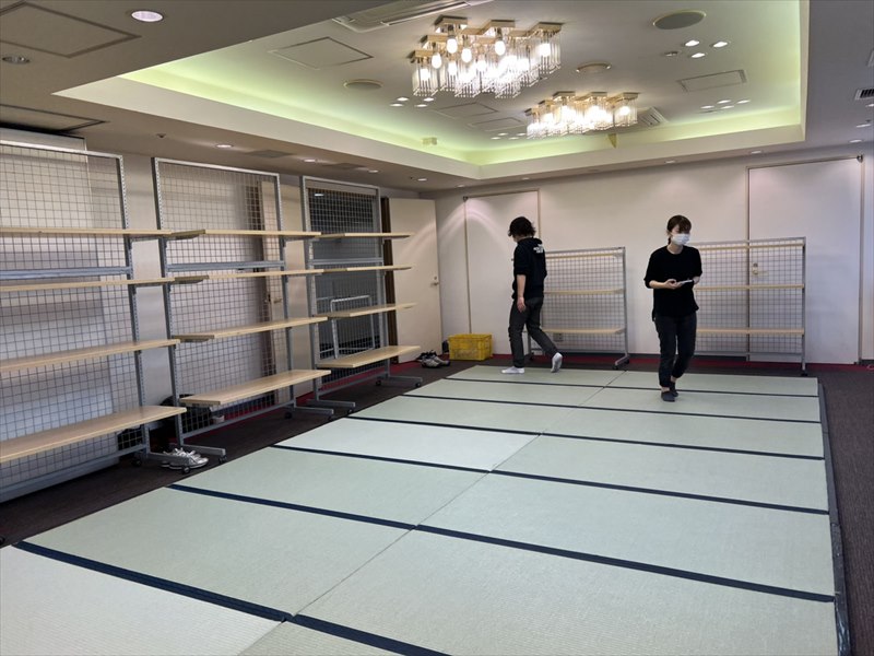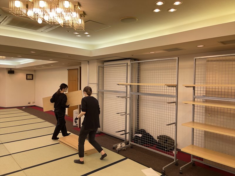 ホテルの会場にて振袖展示会を開催するにあたり、会場内に畳と展示用の棚を設営しました。畳を敷くことで和の雰囲気を演出し、ホテル会場でありながらも落ち着きのある、振袖がより美しく引き立つ空間づくりを行っています。また、展示用の棚は振袖や小物を見やすく配置できるよう動線や高さを考慮し、来場者の方がゆったりとご覧いただけるレイアウトとしました。