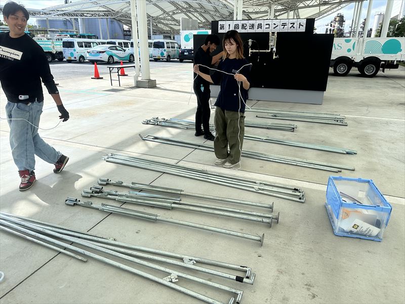 まずはテントの脚や各部材を所定の位置に並べ、12坪テントを建てる場所を丁寧に確認します!
