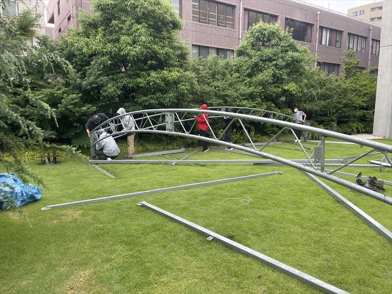 皆で協力しながら、10mテントの部材を組み上げていきます!