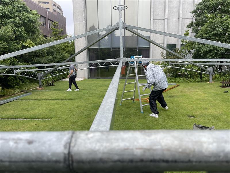 全体のバランスを確認しながら、各部材を順番に固定することで、安定感のある構造に。大型テントならではの迫力を感じつつ、安全第一で丁寧に組み立てを進めていきます!