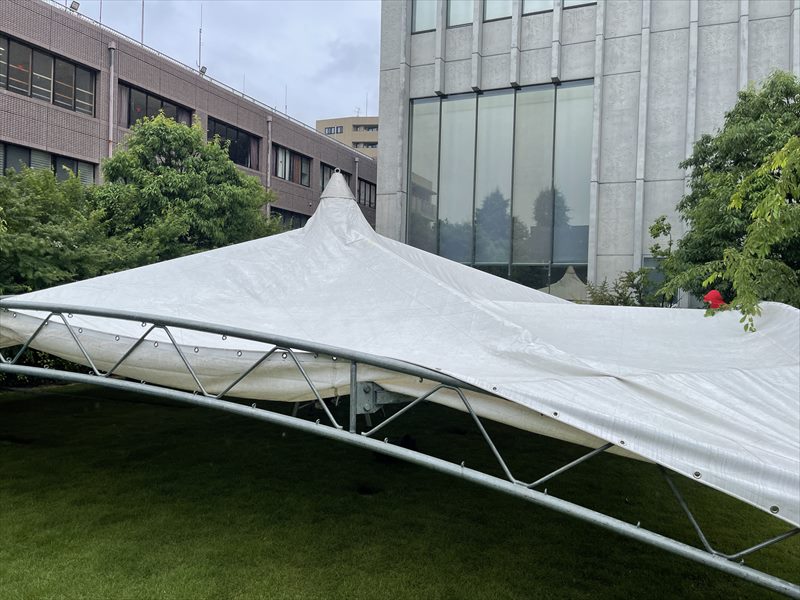 声を掛け合い、位置やズレを確認しつつ作業を進めることで、きれいに均等に張ることができます。天幕が掛かると一気にテントらしい姿になり、会場の完成イメージもぐっと明確に。チームワークを活かして、仕上げまで丁寧に進めていきます!