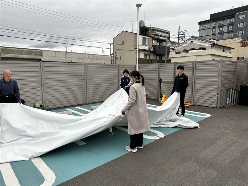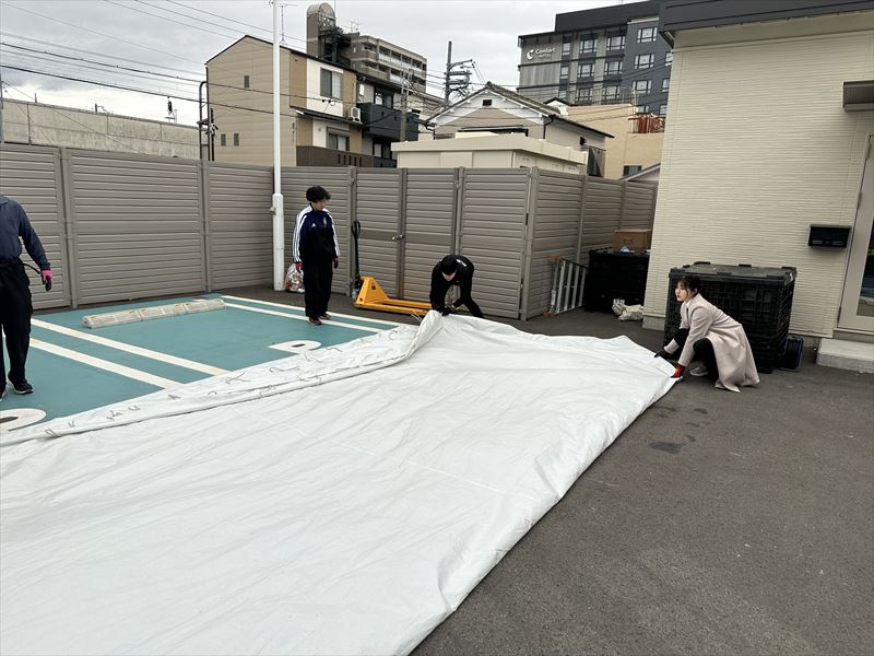 天幕はサイズも重さもあるため、スタッフ同士で声を掛け合い、バランスを確認しながら慎重に作業を進めます。一気に引き上げるのではなく、四方の位置を整えながら取り付けることで、シワのないきれいな仕上がりになります。