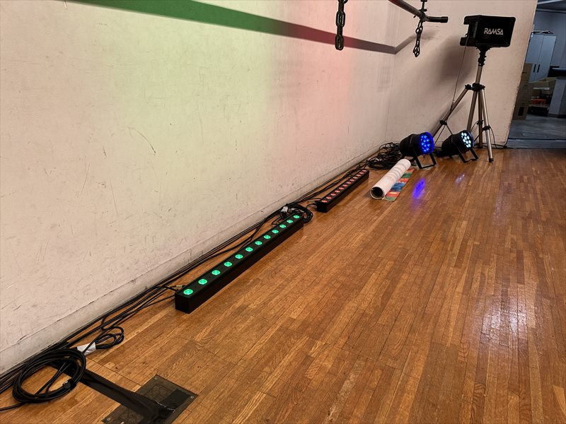 フロア前方にはフットライトを等間隔に配置し、壁面に向けて柔らかく光が広がるよう調整していきます!LEDパーライトと組み合わせることで、空間全体に立体感と奥行きが生まれ、演出のベースとなる照明環境を整えています!
