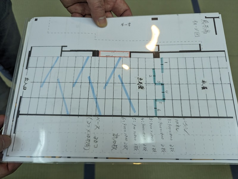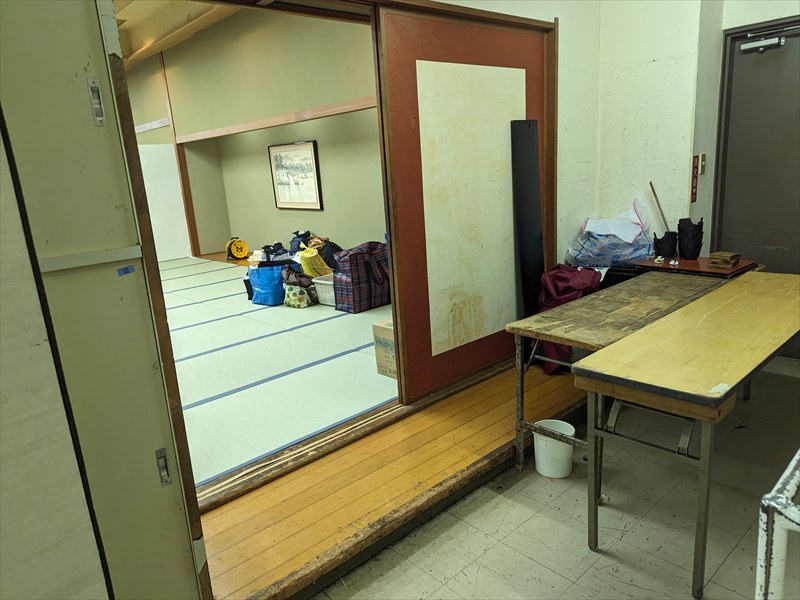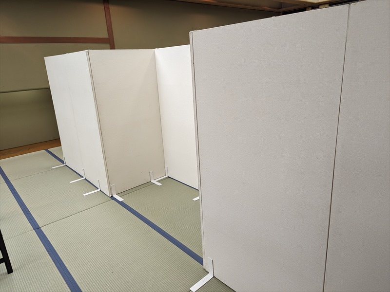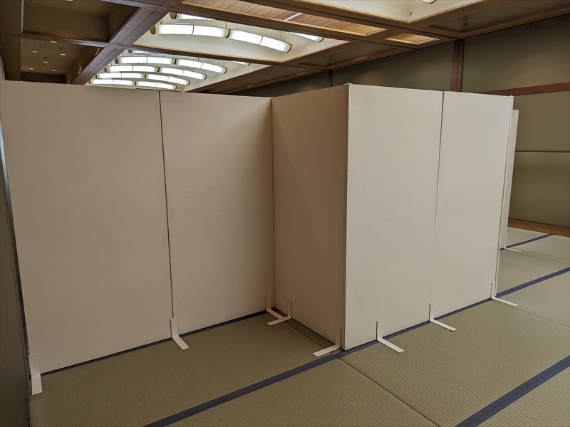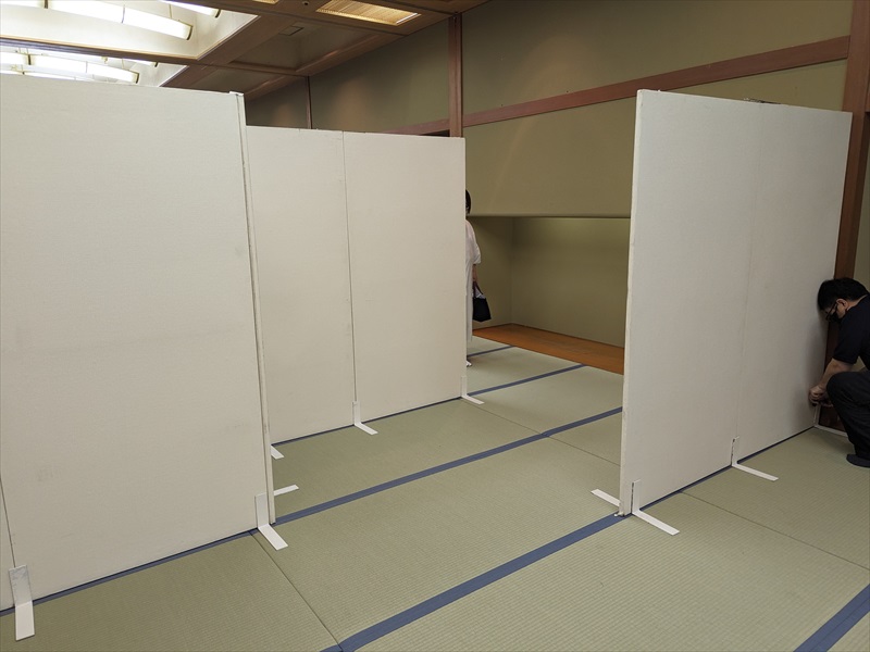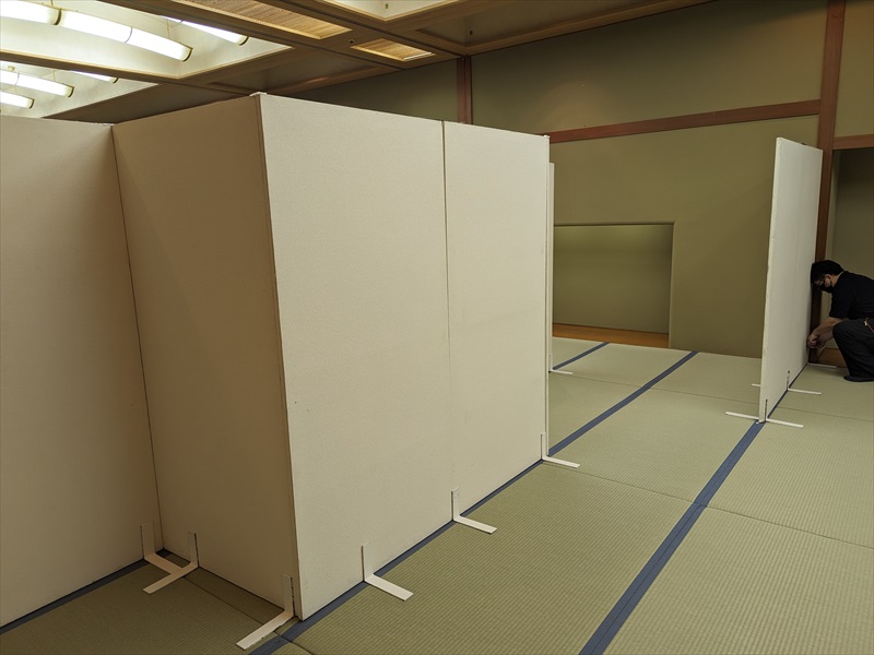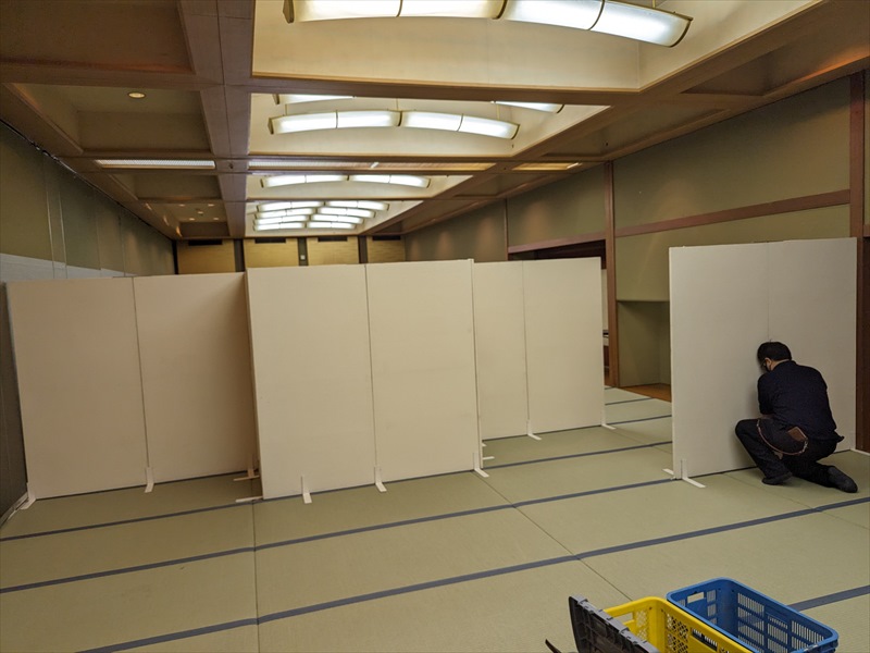 会場内部は畳敷きの和室空間となっており、建物の雰囲気を損なわないよう、床や柱、建具への配慮を徹底する必要がありましたので、養生材を十分に使用したうえで、事前に共有いただいていたレイアウト図を何度も確認しながら、設営位置や通路幅を丁寧に確認し、設営準備を段階的に進めていきます!