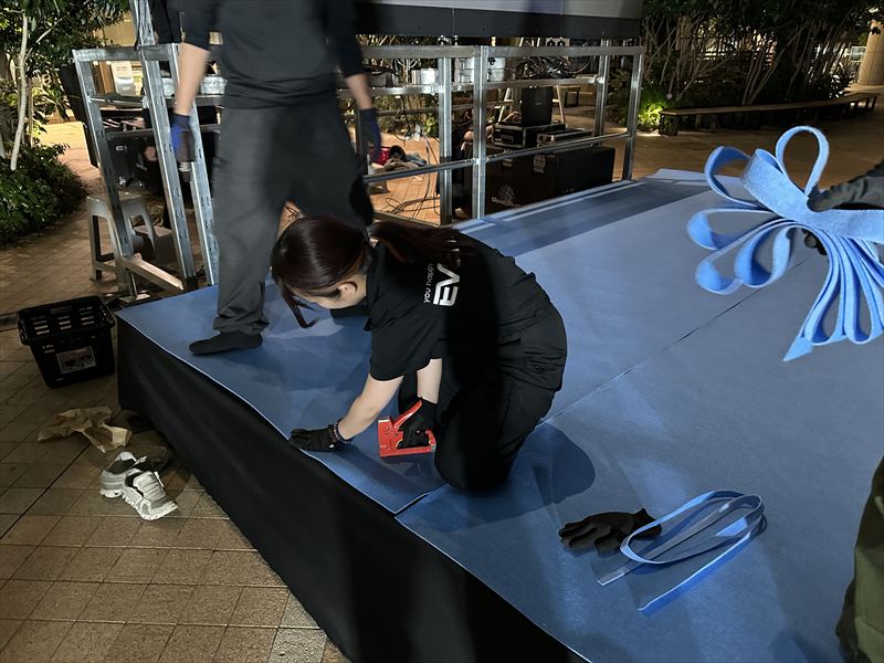 安全面を最優先に、水平確認や固定作業を丁寧に行い、屋外イベントならではの環境に配慮しながら作業を進めていきます!