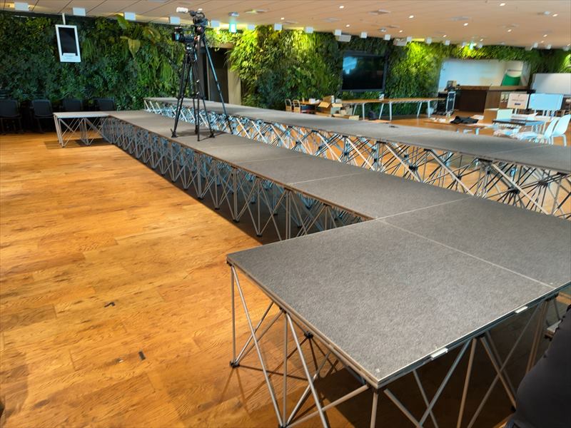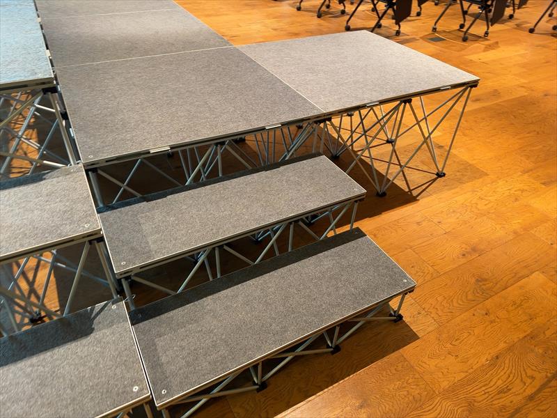 会場の特性を活かし、複数のステージ台を組み合わせたレイアウトをお客様と事前に話し合いながら決めていきました!演者やカメラ機材が上がることを想定し、強度や安定性を重視した設営を徹底し、細部まで安全確認を行いながらステージを構築させていただきました!
