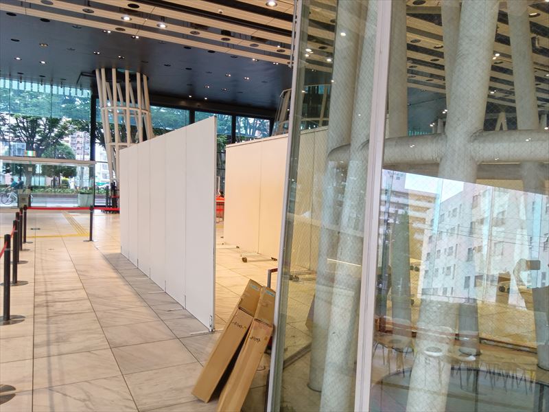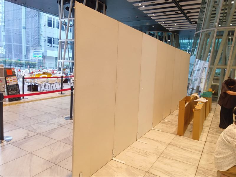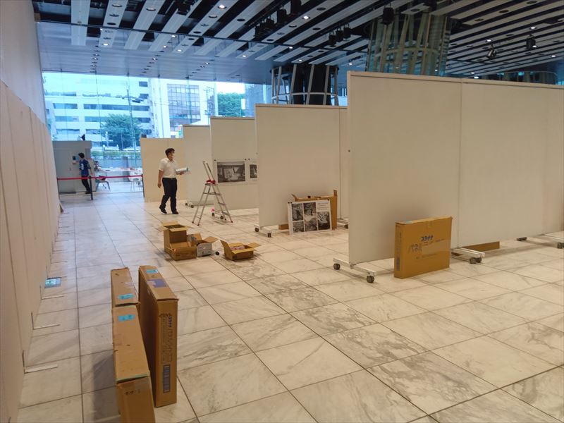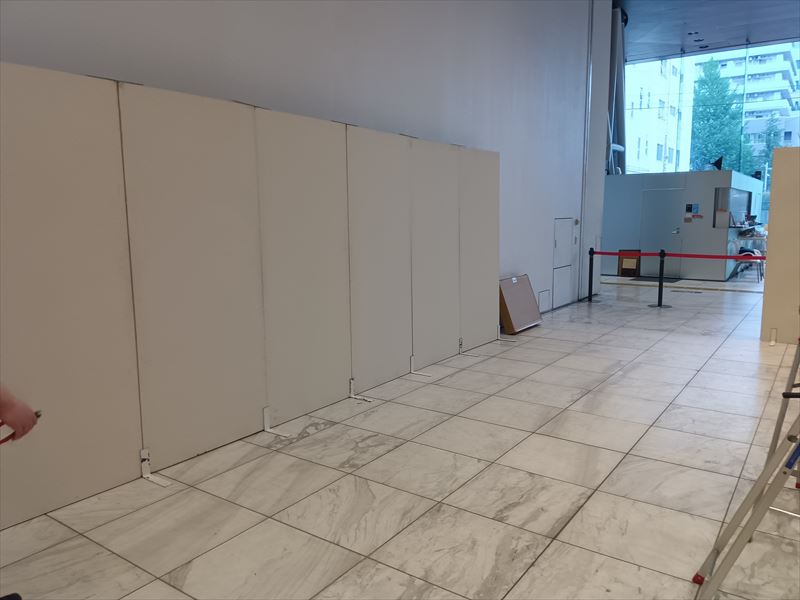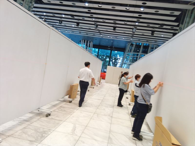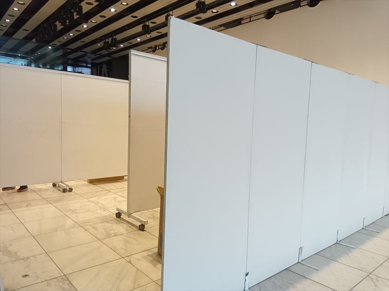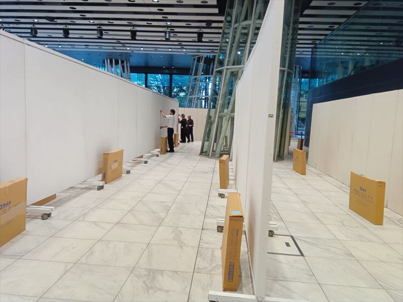 床面や通路の養生状態を確認しながら、来場者の動線を妨げない配置を意識し、パネルを仮置きしていきます!