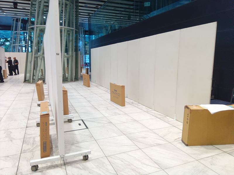 広い会場内に可動式の展示パネルが順序よく搬入していき、設置予定エリアごとに資材を置くことで効率よく作業できるようにしていきます!