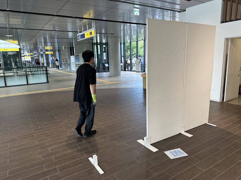 床のタイルや天井の照明、周囲の案内表示との位置関係も確認し、来場者が自然に展示へ目を向けられる配置を意識しました!
