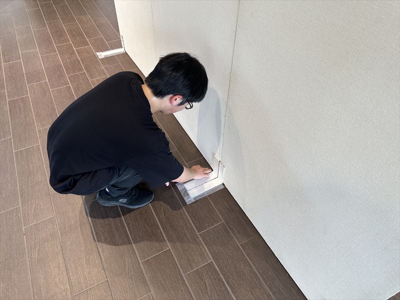 床を傷つけないよう養生を行い、金具の位置や角度を細かく調整しています!