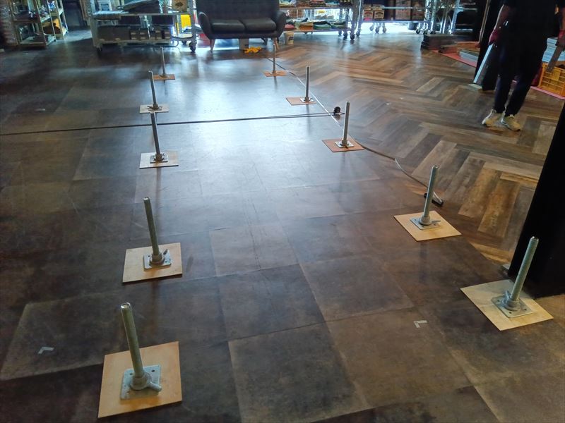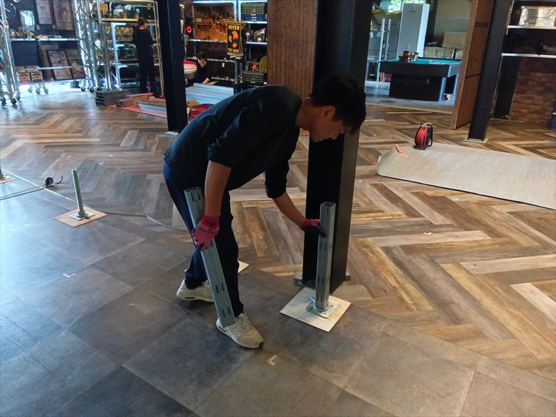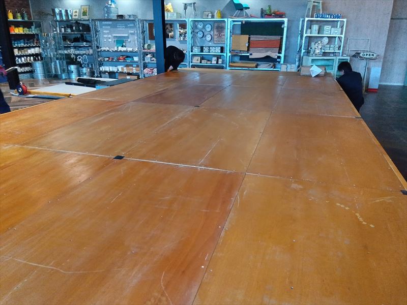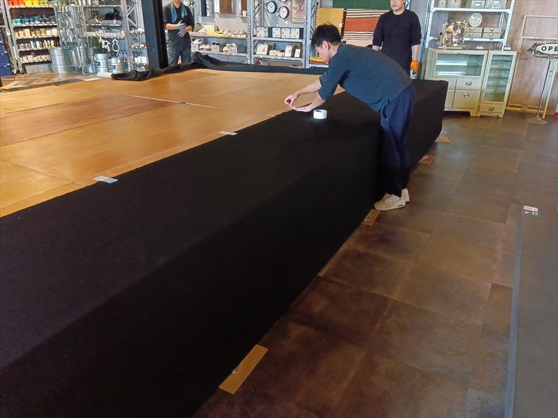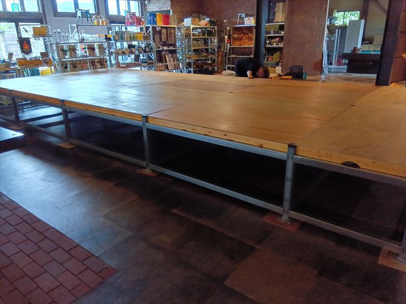 設営したのは建物の奥にあるイベントスペースでした! 手前にはレストランがあり、雑貨が沢山並んだ棚がずらりと置いてあったのでぶつけないように慎重に搬入を行いました!床がフローリングだったので念のために持っていっていた養生用のパンチカーペットを敷いてその上にステージ用の部材を置きました!ステージの天板は大きくて重量があるので二人で持ち運びました!