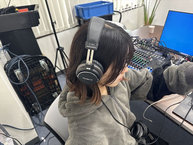 ヘッドホンを装着し、音響・配信機材の音をリアルタイムでモニタリングしていきます!
