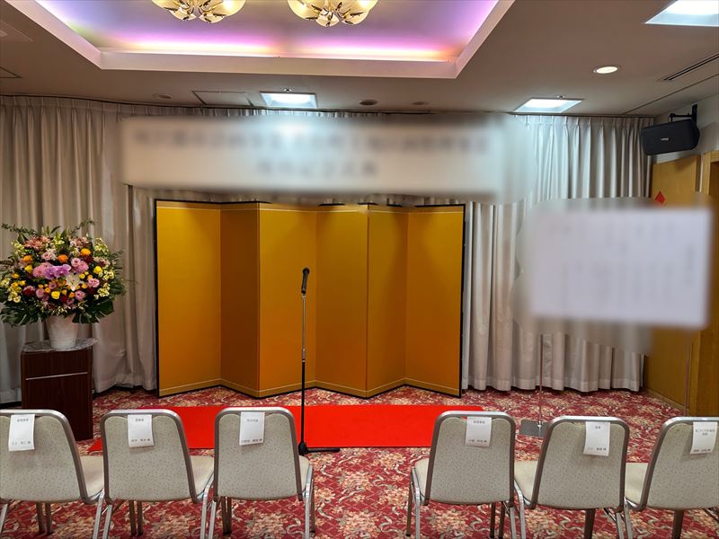 埼玉県所沢市にて、記念式典の会場設営を担当しました!パンチカーペットを敷き、金屏風6.2尺(柄付き)を設置することで、式典にふさわしい華やかな空間を演出しました!式典花や花台も丁寧に配置し、来場者の視線や動線を意識しながら一つひとつ整えています!
