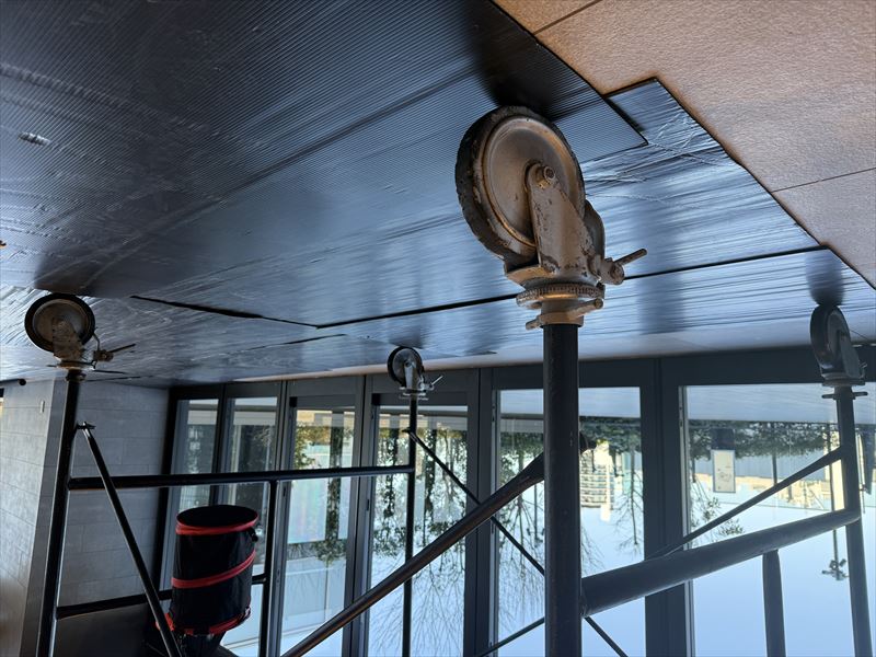 アンチとキャスターを活用し、段差や傾斜のある会場でも安定した足場を確保できました!設営中は水平や固定状況を一つひとつ確認しながら作業を進め、スタッフ同士で声を掛け合い、安全第一で施工しました!