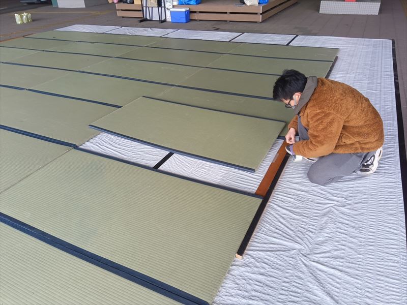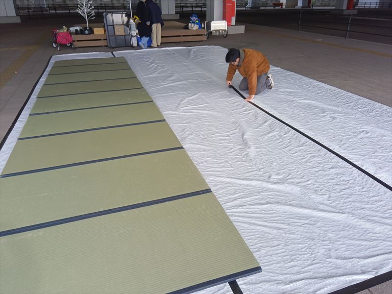 仙台市太白区八木山駅前のバスプールロータリー前にある広場で畳を設営させていただきました! 屋外で畳を敷くということで養生用のシートを全面に敷いた上に設置を行っています!