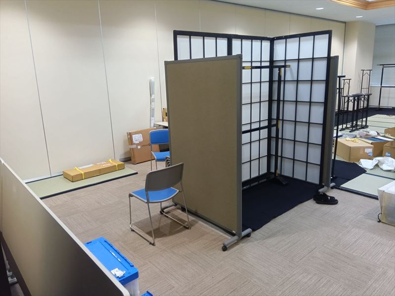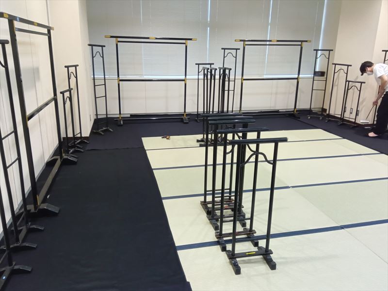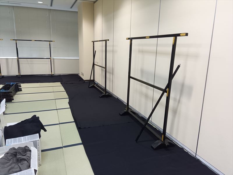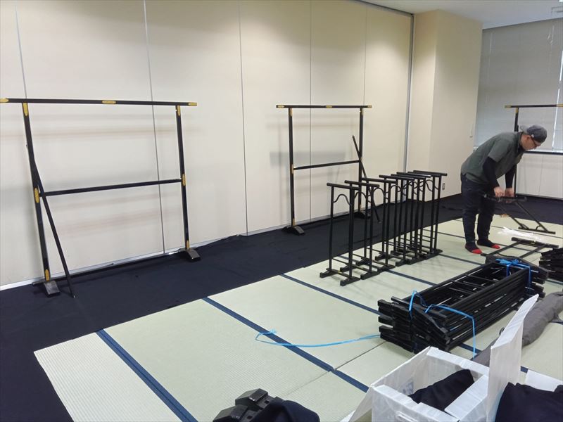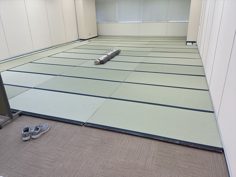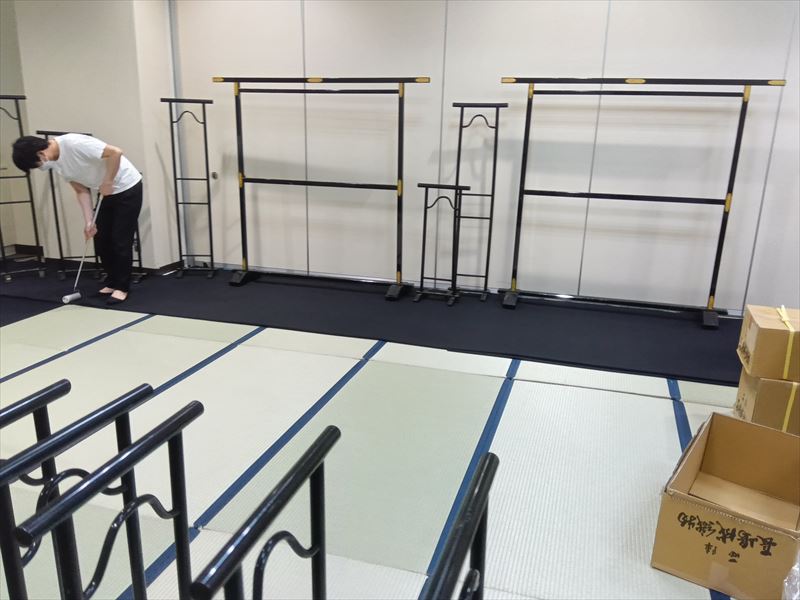 最初の作業として畳を敷き、会場の形状に合わせて一枚一枚の位置を調整しながら、見た目の美しさと安定感を意識して丁寧に敷き詰めました!