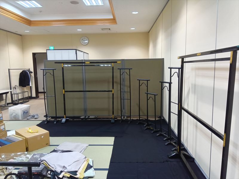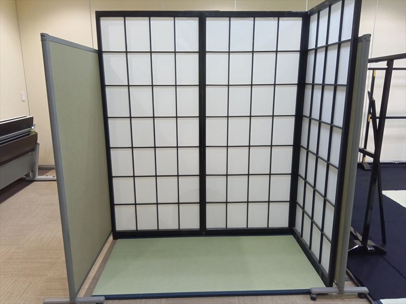 今回は福島市にて着物販売会の会場設営を行いました!スタイロ畳や衣桁、撞木、姿見、毛氈、障子パネルなどを用い、落ち着いた和の雰囲気と華やかさが同時に感じられる空間づくりを意識しました。会場の広さや形状に合わせて畳の配置を一枚一枚工夫し、全体の統一感を大切にしながら丁寧に仕上げました。また、お客様が会場内を快適に歩き回れるように導線を考慮し、姿見や什器の位置も細かく調整しました。特に試着の際に自然な流れでご利用いただけるよう配置を工夫したことで、安心して着物を手に取れる環境を整えることができました。