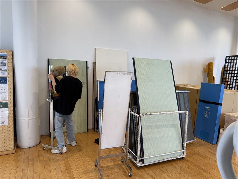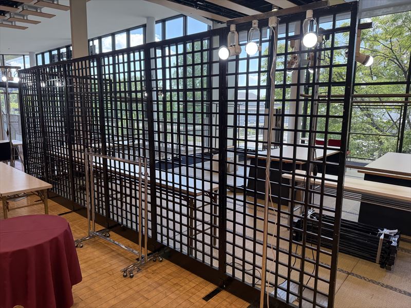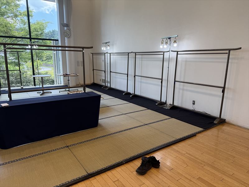 今回の仙台市での呉服展示会では、スタイロ畳や衣桁、撞木、格子パネルといった什器を効果的に組み合わせ、和の趣を強調した空間づくりを行いました。設営にあたって特に意識したのは、来場者が自然な動線の中で着物の魅力を感じ取れるようなレイアウトです。スタイロ畳を基調とすることで会場全体に落ち着きと統一感を持たせ、衣桁や撞木には柄の映える着物を配置し、格子パネルを背景に加えることで一層の奥行きと高級感を演出しました。