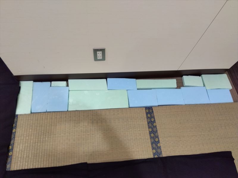 トラックで資材を搬入し、まずはスタイロ畳を一枚一枚丁寧に敷き詰めました!