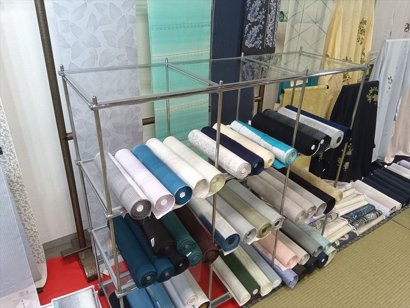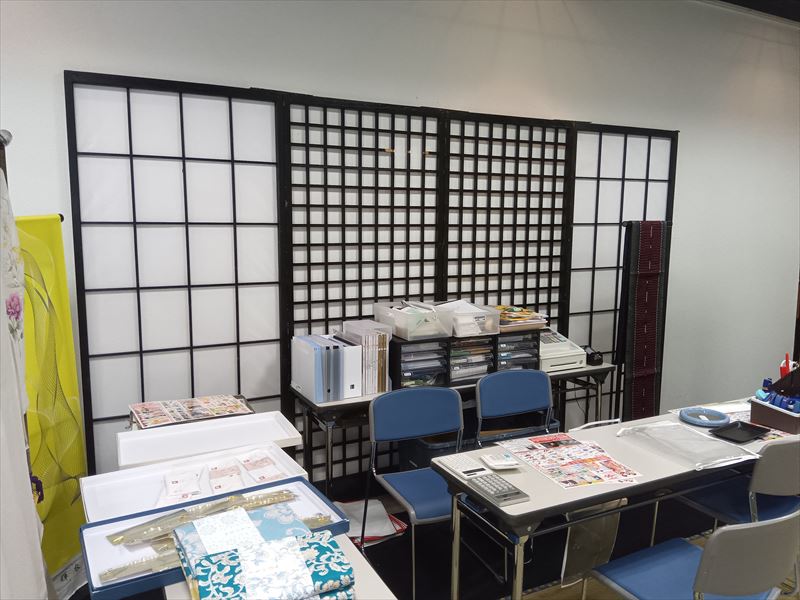 大分県大分市で開催された呉服展示会では、色とりどりの呉服を美しく見せるため、スタイロ畳、衣桁、撞木、黒格子パネル、アブストラック、金屏風、スタンド式スポットライト、毛氈を使って会場を華やかに演出しました!