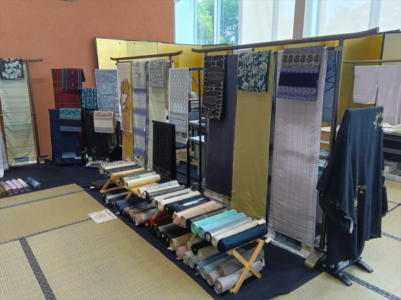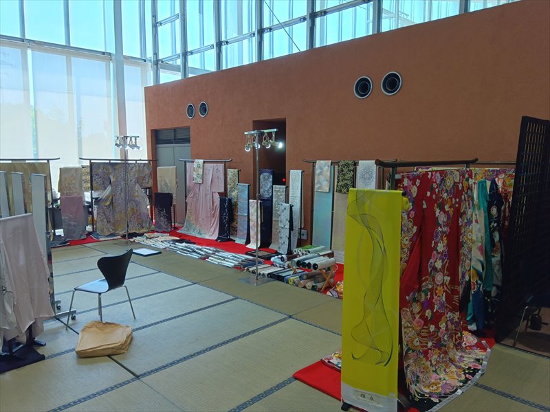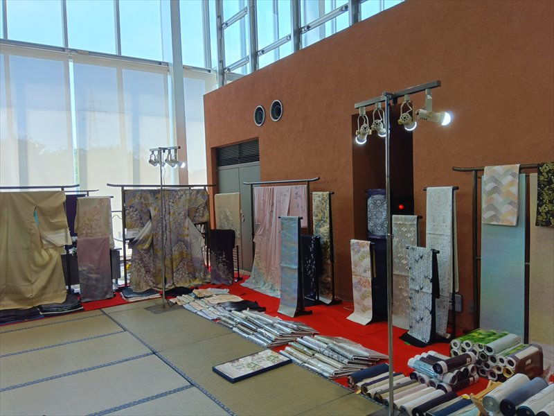 完成した会場は、大きな窓から差し込む自然光とスポットライトの灯りが調和し、呉服がいっそう美しく映える開放的で魅力的な空間となりました!設営の工夫や環境を活かした演出によって、訪れるお客様にとって心地よく特別感のある会場が整い、これから始まる展示即売会への期待感も高まっています!