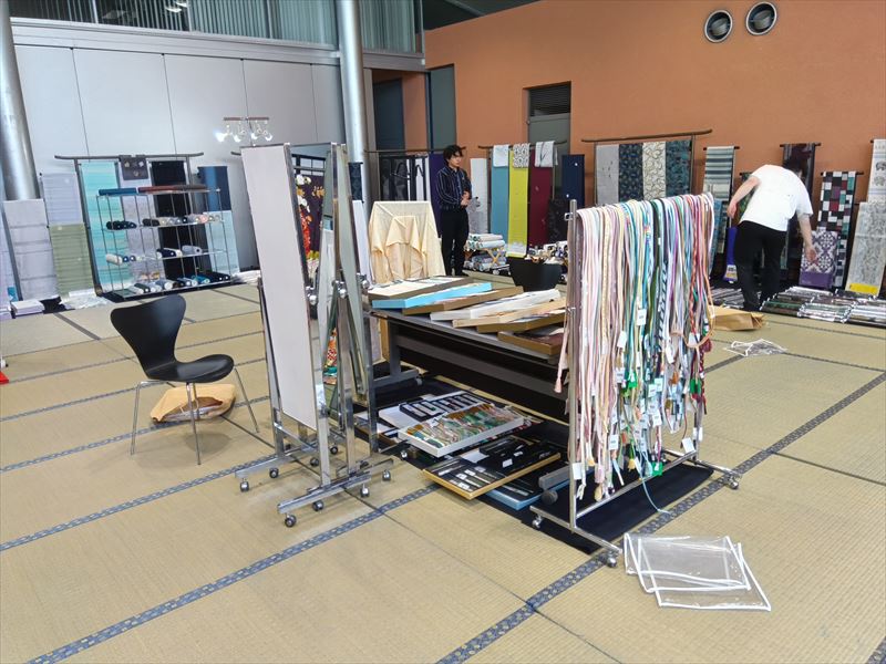 まず最初の作業は、会場の床一面にスタイロ畳を敷き詰める工程です!一枚一枚の位置を細かく調整しながら、隙間なく美しく並ぶよう丁寧に作業を進めました!畳の準備が整った後は、呉服の展示に欠かせない撞木や衣桁などの什器を配置していきます!これらの什器はただの展示用具ではなく、着物の魅力を最大限に引き出すために欠かせない存在です!