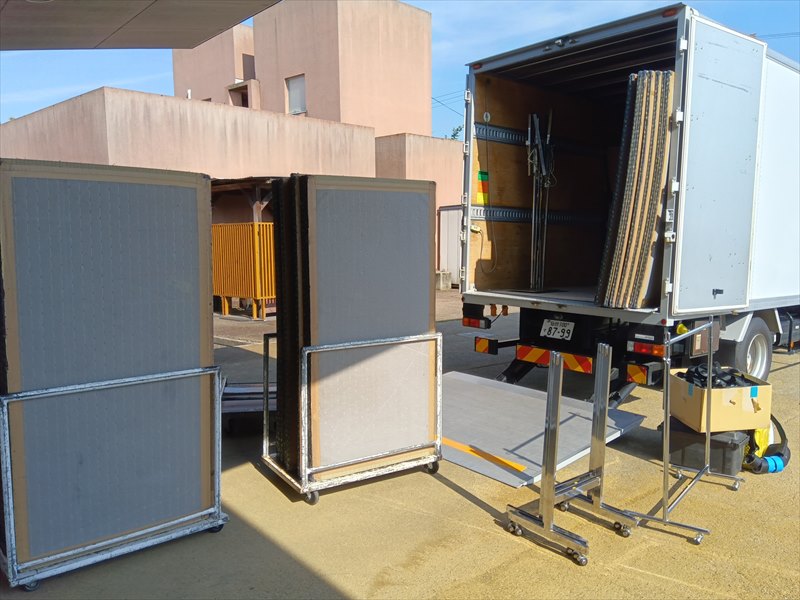 さらに、今回使用したトラックには荷台にリフトが付いていたため、あらかじめ台車ごと積み込みが可能でした!そのおかげで、荷下ろし後も台車に乗せたままスムーズに会場まで運ぶことができ、設営全体がとてもスピーディーに進みました!