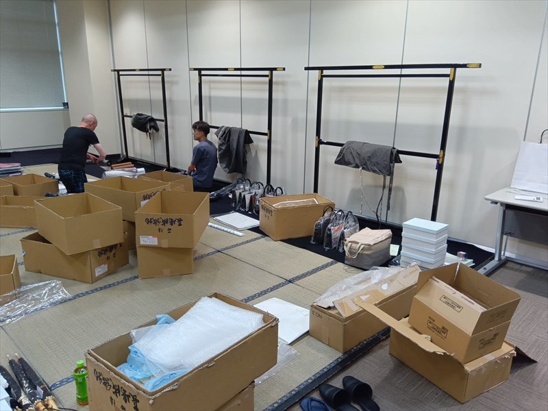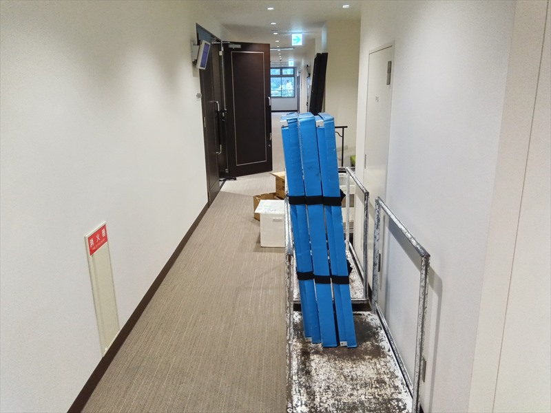 事前に経路を確認し、搬入口から会場までの動線を把握しておくと搬入がスムーズになります。また、今回のように廊下を一時的な仮置き場として利用できるか、事前に会場へ相談しておくことも大切です!