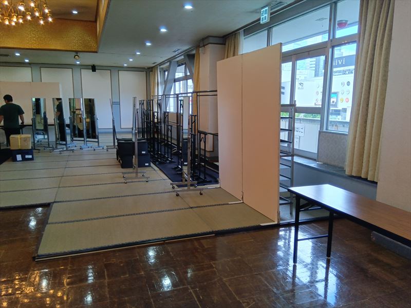 今回は、仙台駅のすぐ近くにあるイベントホールで開催される呉服展示会の会場設営を担当しました! 広々としたホールに、まずは持ち込んだ什器を搬入するところから作業をスタート!