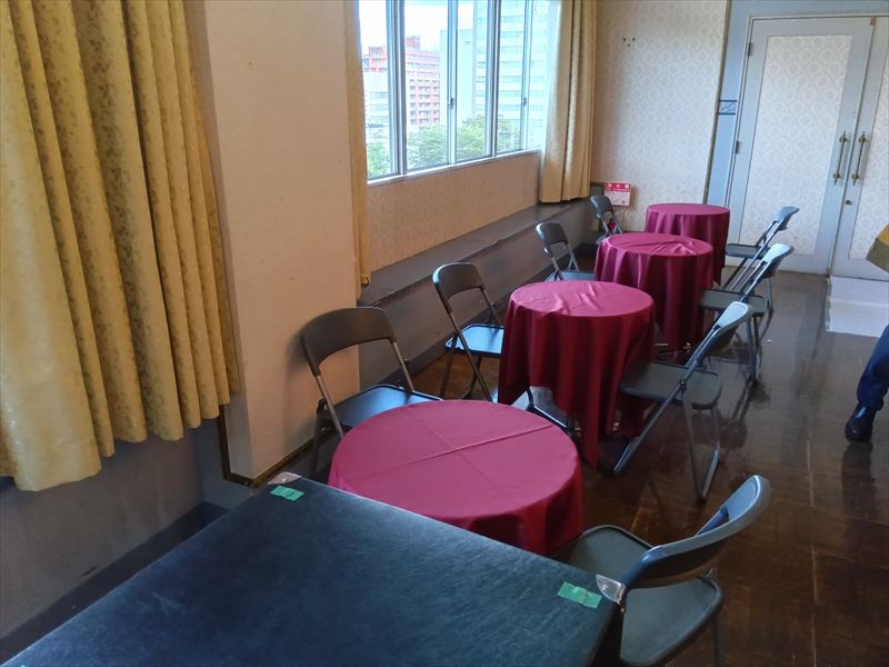 会場のエレベーターを使用できるとのことで、傷がつかないように養生シートを丁寧に貼り、会場の美観にも気を配りながら進めました! 什器の搬入が完了したあとは、畳を一枚ずつ綺麗に敷き詰め、その上に毛氈を広げ、衣桁や撞木などの什器を導線を意識しながら配置しました! また、各ブースを設けるため、会場備え付けの机もお借りし、用途に合わせて設置を行っています!