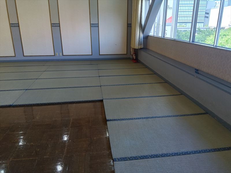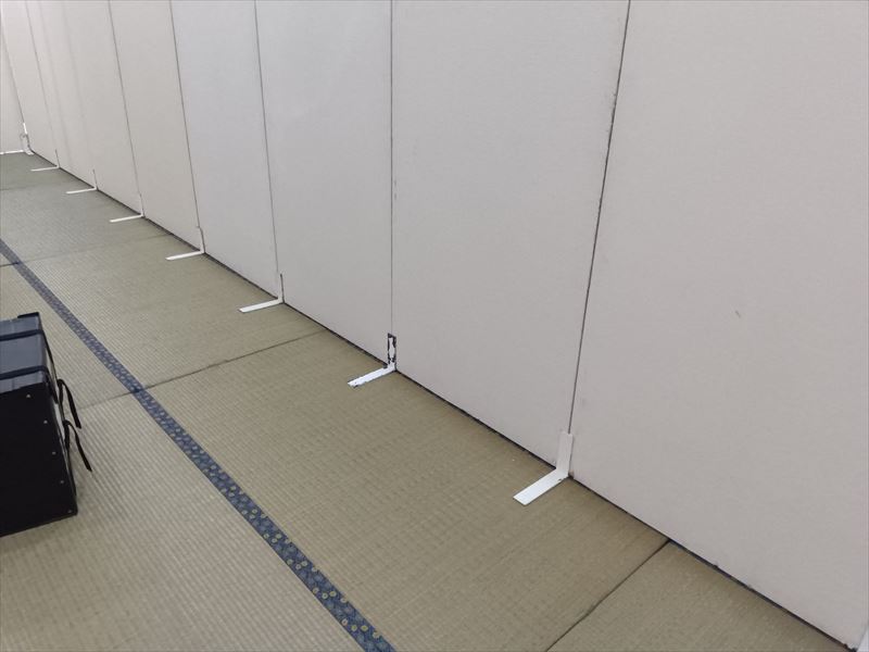 搬入が完了したあとは、会場の角から順に畳を隙間なく敷き詰め、専用の畳止めで固定!