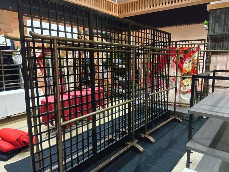 格子パネルの抜け感が着物の繊細な柄や質感を引き立て、展示全体に軽やかさと奥行きをプラスしてくれました! シンプルでありながらも存在感のある黒格子が、和の美しさをより一層際立たせてくれました!