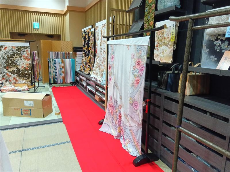 衣桁や撞木を用いた展示では、布の流れや艶が自然に映えるようにレイアウトを工夫しました! 足元には毛氈とスタイロ畳を組み合わせ、季節感と格式を感じさせる雰囲気に仕上げました!