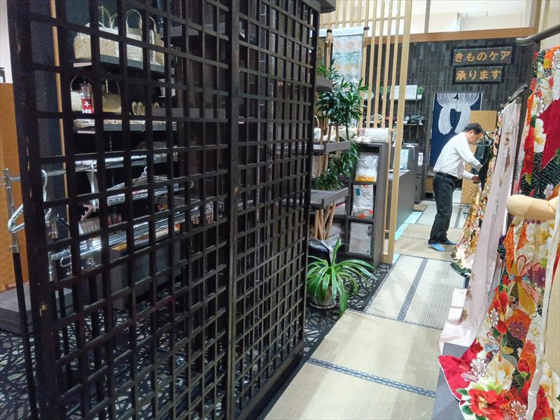 展示会場には、黒格子パネルを中心に、畳・毛氈・衣桁・撞木など和の演出に欠かせないアイテムを配置し、着物の美しさを最大限に引き出す設営を実現しました!
