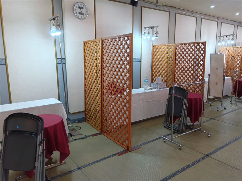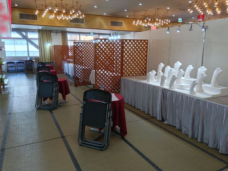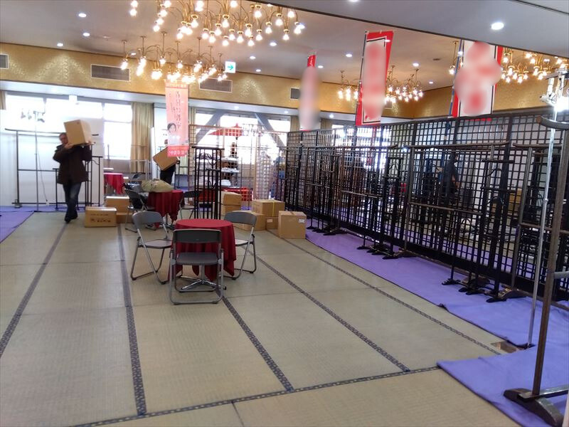 仙台市宮城野区で開催された大規模な呉服イベントの会場設営を担当しました! 今回はいつも以上に広い会場で、搬入から配置までかなりの物量でした!最初は床の養生と畳設置から始まり、ズレが出ないよう細かく調整しながら一枚一枚丁寧に敷き詰めていきました!