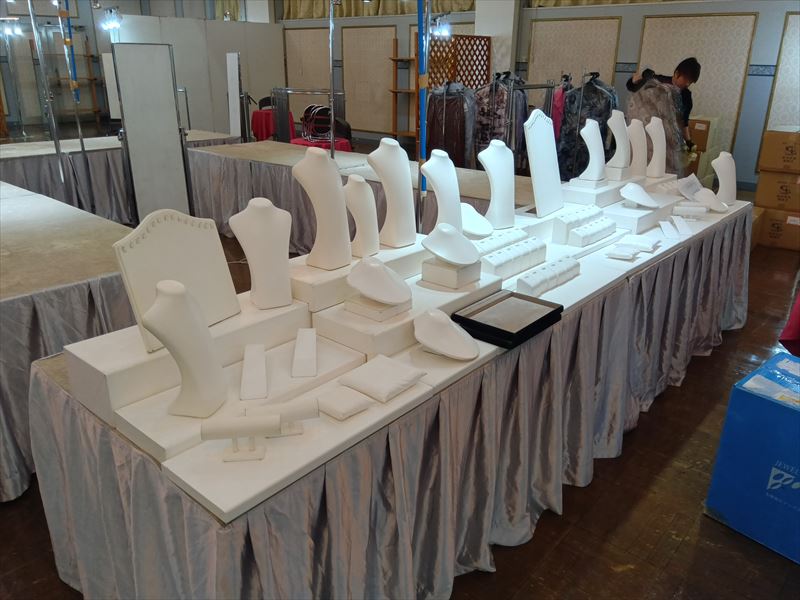 照明の映え方や通路幅にも気を配り、お客様が安心して呉服をご覧いただける空間を目指しました!体力的には大変な現場でしたが、その分やり切った充実感のある設営となりました! 呉服展示のレンタル品、設営はトップスプランにお任せあれ!